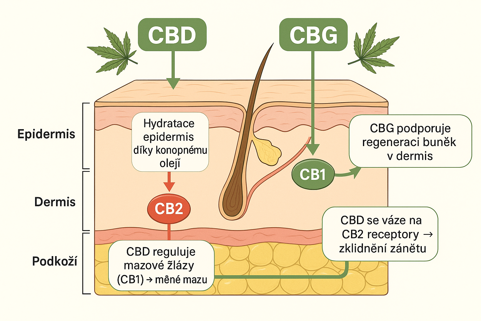 Naše pokožka má vlastní endokanabinoidní systém – síť receptorů CB1 a CB2, které se nacházejí v buňkách kůže, mazových žlázách i vlasových folikulech. Jejich úkolem je udržovat rovnováhu (homeostázu).