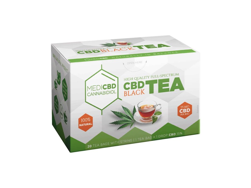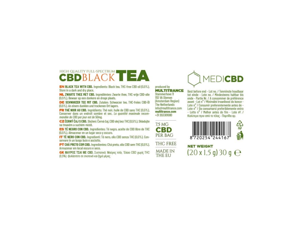 MediCBD Black Tea je kvalitní černý čaj aromatizovaný CBD extraktem, přičemž každý sáček obsahuje 7,5 mg CBD. Produkt je bez THC (0 %), v souladu s evropskými normami.