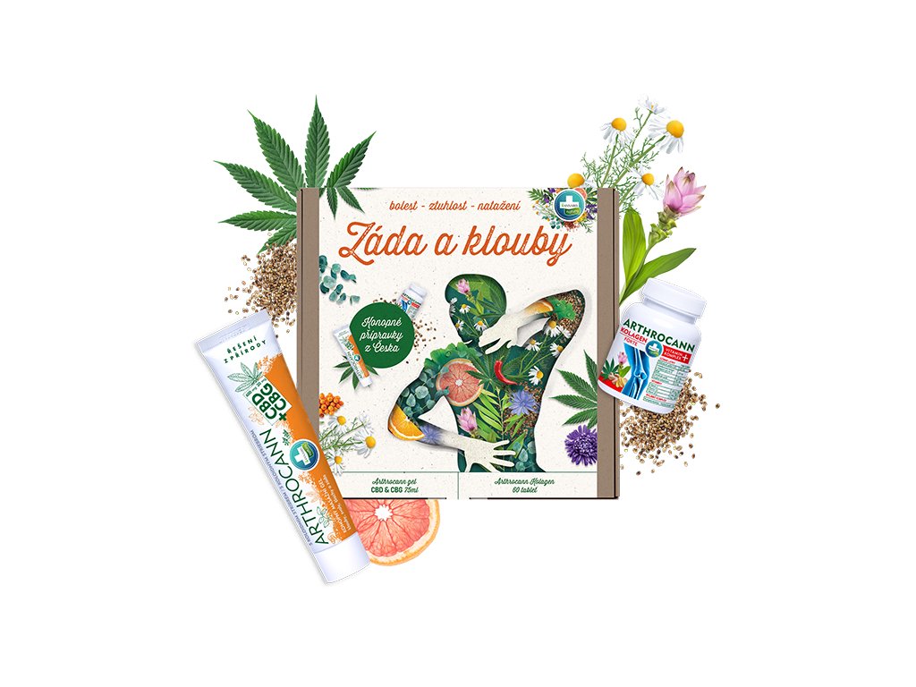 Dárková sada pro silné klouby, svaly a šlachy obsahuje špičkovou kloubní výživu a nejprodávanější masážní konopný gel Arthrocann s CBD (600 mg) & CBG (20 mg).